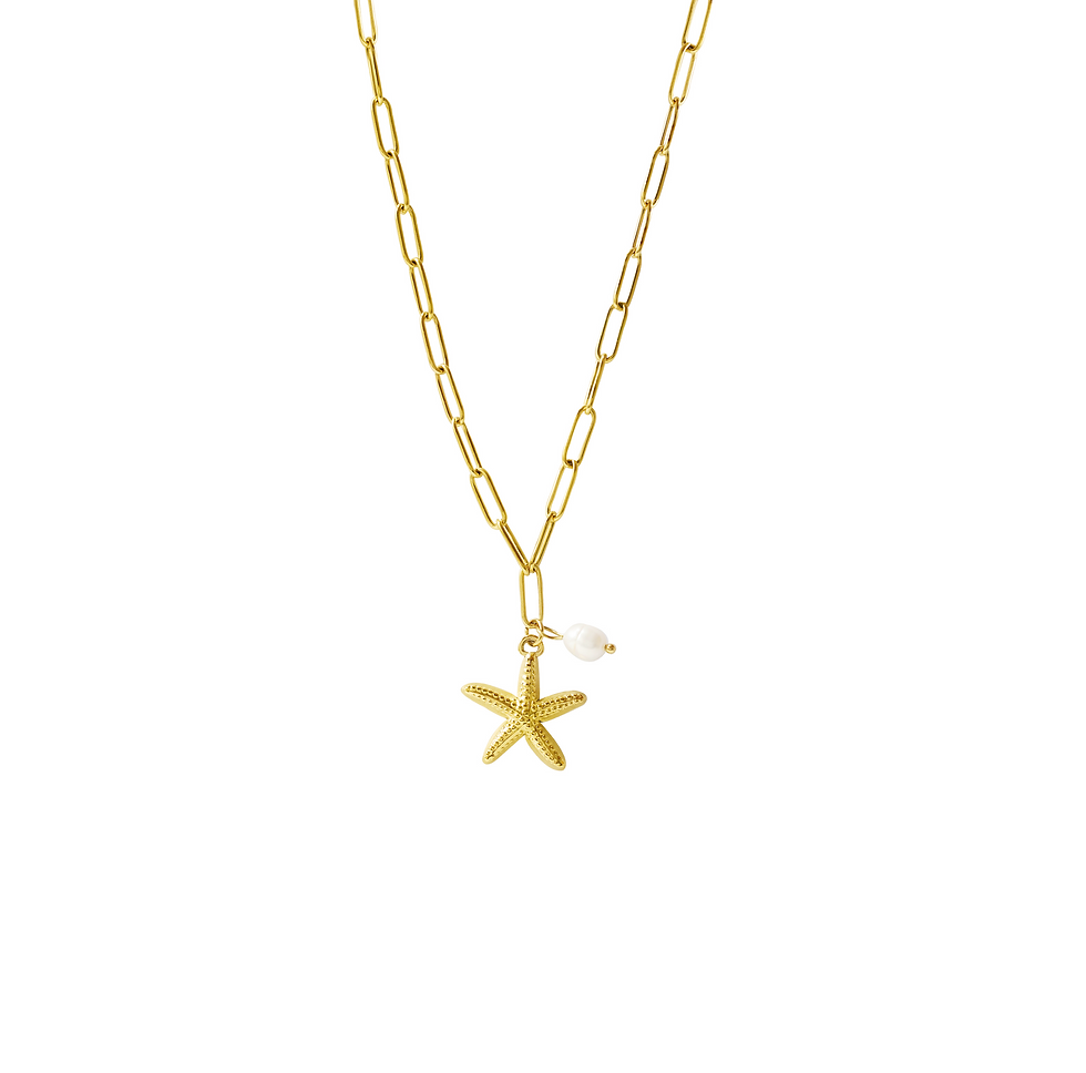 Starfish, Shell & Pearl Necklace - Gold Plated Stainless Steel